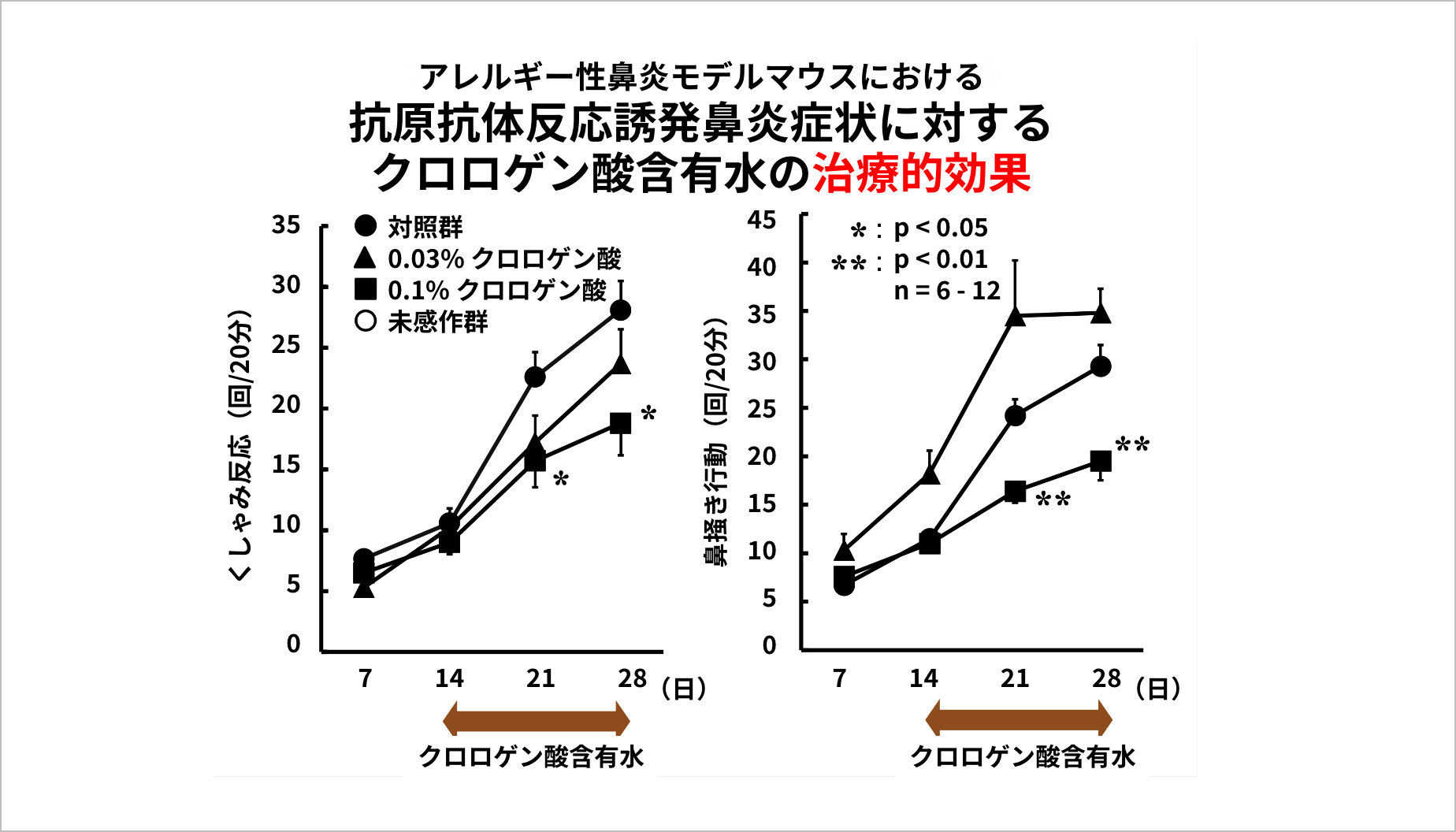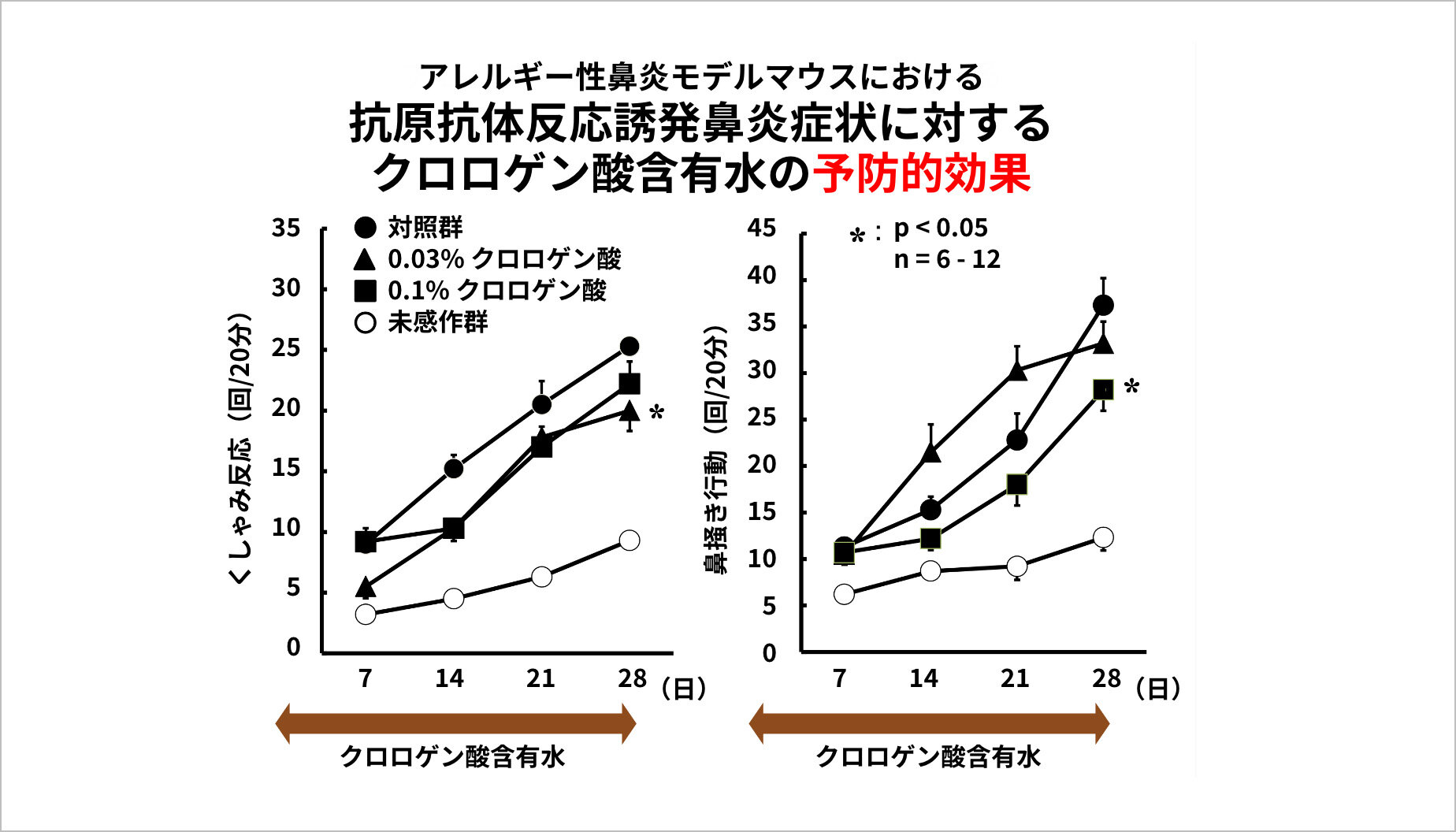 その結果、アレルギー性鼻炎モデルのマウスでは、クロロゲン酸含有水を飲むことで、くしゃみと鼻掻きの回数が抑えられたという結論に。クロロゲン酸含有水を与える時期によって「予防効果」と「治療効果」の2つを測定したところ、いずれにも効果が認められました。
