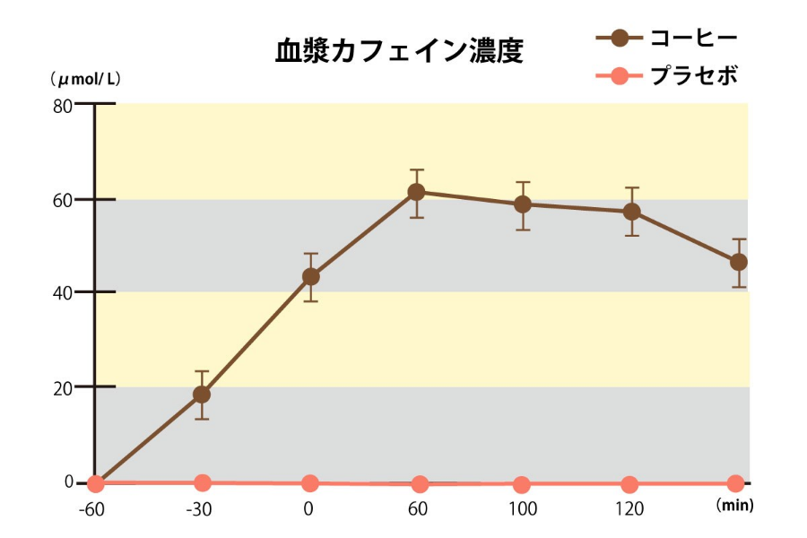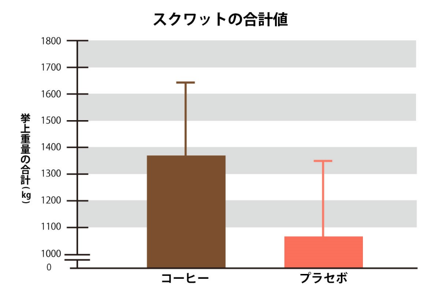 主観的運動強度といって、競技後どのくらい疲れているか・痛みが軽減するかでパフォーマンス効果を判断します。コーヒーを飲んでから、スクワットや長距離走などの持久系の運動を行った場合、疲労困ぱいまでの時間が長くなるという結果が報告されています。