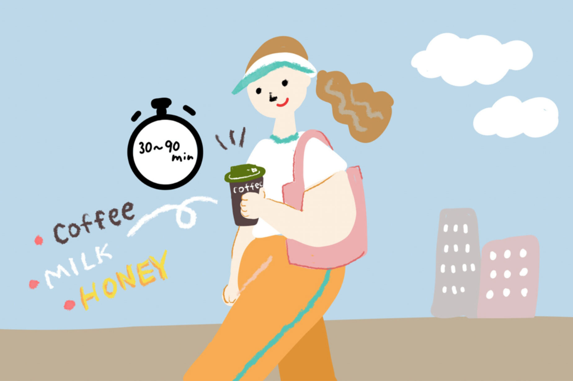 カフェインは飲んですぐ、15分ほどで体に作用する即効性の高い成分ですが、効率よく働かせるには、摂取してから30~90分のゴールデンタイムを狙いましょう。ジムへの移動中、コーヒータイムを設けるのもおすすめです。