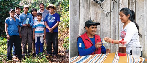 左から:アプセルの生産者とWCSスタッフ。中央で「鳥のエコー」ブランドのコーヒーパッケージを手にするのは、4haの農地を営むアプセル現会長のフェルナンド・イラキタさん。/コーヒー鑑定士である娘のダイアナさんに、自ら栽培した豆でコーヒーを淹れてもらう父ベニート・ケアさん。