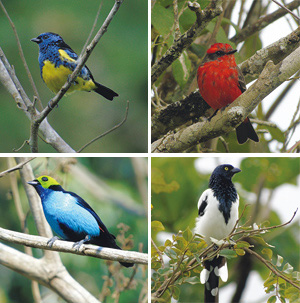 左上からトルコイシフウキンチョウ、ベニタイランチョウ、ナナイロフウキンチョウ、カササギフウキンチョウ。アプセルは、国の指定する野鳥保護重要区域の一つであるベジャ・ビスタ内に位置し、ボリビア全国で確認されている約1400種の野鳥のうち約17%がこの地域に生息する。