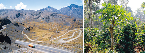 左から:ユンガス地方からアンデス山脈を上りラパスへと通じる国道3号線。ボリビア産コーヒーのほとんどは、このルートをたどって輸送される。/中央の樹木セイボは、カリウムを土壌に注ぐ生きた栄養源として、国の農業研究所CATIEの指導で植樹された。