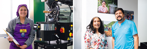左から:オリヘン焙煎担当のサンドラ・アルコンさん。/WCS生産企画部長のヒメナ・サンディさん(左)と同団体のコーヒー専門技術者のホルヘ・ロハスさん。