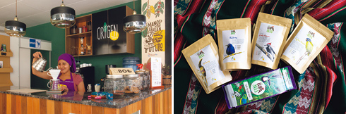左から:昨年4月に開店したオリヘンのカフェスペース。同じフロアにコーヒーの焙煎室とチョコレートの貯蔵室を構える。© Origen/鳥類図鑑のイラストレーターが手掛けた「鳥のエコー」パッケージ。上の4つは、生産者の名前入りスペシャルエディションのもの。