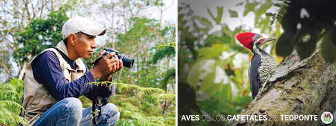 左から:取材時にも野鳥を撮影していたクルスさん。撮影エリアで育ち、暮らし続けていることもあって、野鳥を見つける目は確かだ。/写真集『テオポンテのコーヒー農園の鳥』の表紙。