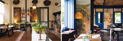 右ページ:石造りの流し台もまた、農園に放置されていたものを修繕。流し台は食堂の片隅に配置し、周りをポルトガル風タイル「アズレージョ」で飾った。アズレージョは、植民地時代からブラジルの建築で多用されてきた。