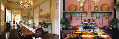 左から:展示用のかつての食堂。壁画は現代画家ドミニク・ジャルディによるもの。/宿泊客でなくとも100レアル(2021年6月現在で約2,140円)で楽しめる昼食ビュッフェ。