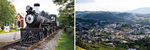 かつてコーヒーを輸送した蒸気機関車と元鉄道駅。/2019年開設の展望台からの街の眺め。