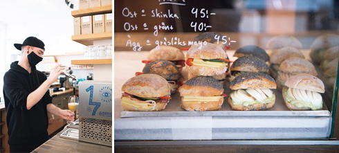 左から:窒素入りアイスコーヒーのシステムはサイドキック社製。同社はシステム開発当初からヨアンナさんのコーヒーを採用している。/サンドイッチも欠かせない(SEK40〜)。