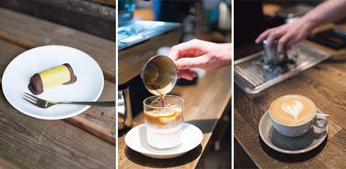 左から:マジパンとチョコレートで包まれた「ダムスーガレ(掃除機)」という名のお菓子(SEK35)。/アイスラテ(SEK48)は近郊の酪農場の牛乳にダブルエスプレッソを。/カプチーノ(SEK40)。エスプレッソはエルサルバドル産「Los Andes」。