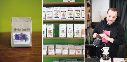 左から:コーヒー豆のパッケージ。厚手の箱の中(左)に、店のシンボルカラーの袋(右)が入っている。/窒素の細かな泡を吹き込む「サイドキック・コールド・ブリュー」(SEK45)。クリーミーでミルクや砂糖なしで楽しめる。豆はヨアンナさん好みのエチオピア産「Hunkute」を使用。/人気のドリップコーヒー(SEK42〜50)。約10種類から選べる。