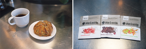 左から:スウェーデンの定番カルダモンロール(SEK38)。フィーカに人気だ。/シングルオリジンにはドリップバッグ(SEK22)もあるので手軽に試せる。