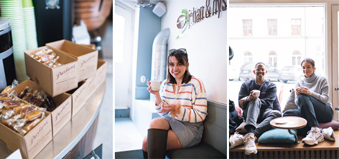 左から:同じエリア、セーデルマルム地区で手作りされている「ペーランズ」のキャラメル(SEK11)。/「この店のコーヒーがないと」という常連客のひとり。/いつもはお茶派だという2人。お茶は10種類ほどが揃い、それを目当てに来る客も多い。