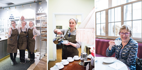 左から:制服にはメイド服の面影が残る。右からイサベラ・アウルさん、ヴェンデラ・フリスクさん、メリエム・ジャナティさん。後ろはベーカーのベント・カールソンさん。/旧館では創業当初から変わらないスタイルでポットから客が自分でおかわりを注げる。/1970年代からの常連客。カルダモンロールとコーヒーが定番だ。