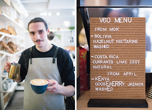 左から:ノーベル賞の晩餐会に7年連続で選ばれたスマトラ産ガヨマウンテン(SEK185)。/シングルオリジンは、旬の時期のみの季節限定販売(SEK155〜)。/丁寧にペーパードリップ(SEK50)するバリスタのセルゲイ・ミナコヴさん。