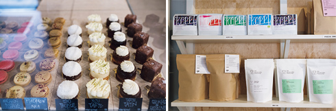 左から:ペストリーには季節の果物を。/「コピ」「MOK」の豆(ともにSEK180)、カフェオリジナルの豆(SEK160)。