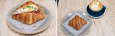 左から:クロワッサン卵サンド(SEK67)。/焼きたてクロワッサン(SEK32)にラテ(SEK45)は朝に人気だ。