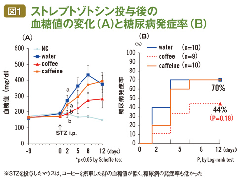 堀尾さんはβ細胞を破壊して1型糖尿病を誘発する試薬「ストレプトゾトシン」(以下、STZ)をマウスに投与し、血糖値の変化と糖尿病の発症率を見た(図1)。すると、STZ投与9日前から投与後12日までコーヒーを摂取したマウスは、膵臓のインスリン含量の低下が抑制され、糖尿病の発症率も下がり、膵臓ランゲルハンス氏島のβ細胞が破壊されることを防ぐ効果があることがわかった。また、これとは別にデカフェも用いたところ、糖尿病発症を抑える傾向が見られた。