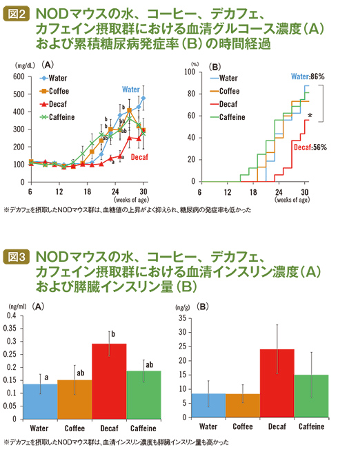 そこで翌年、堀尾さんは自然発症するヒトの1型糖尿病とよく似たモデルのNODマウスで実験を行なった。6週齢のNODマウスを4群(1群=16匹)に分け、①水(コントロール群)、②コーヒー(飲水として2・5倍希釈ブラックコーヒー)、③デカフェ(同)、④カフェイン(飲水として200㎎/Lカフェイン水溶液)を与え、30週齢までの24週間飼育した。