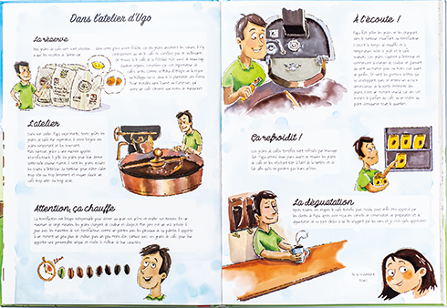 左:主人公の父親ユーゴは焙煎士。この見開きではルナが父親の焙煎所カフェを舞台に、焙煎のステップや焙煎士の仕事について説明する。ルナが語ることにより、子どもの言葉で分かりやすく表現されている。