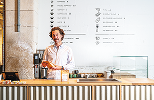 今回の取材場所として著者のペレさんが選んだのは、ボルドーを拠点とする焙煎所「ラルシミスト」。『サンフォニー・カフェ』の中でも名前が使われている、ペレさんのお気に入りだ。店主のアルチュール・オーディベールさんはパリの名店『クチューム』で焙煎を学び、2014年に独立。産地の収穫カレンダーに即して旬の豆だけを仕入れ、ラインナップを入れ替えつつ、常時8~10種類の豆を厳選して扱っている。顧客は個人客から有名レストラン、企業まで幅広いが、どの規模のお客にも、環境保護や持続性のある消費行動を推奨するのが信条だ。ゴミの出るカプセル式マシンを減らすため、グラインダー付きのゴミの少ない抽出機と豆の定期納品をセットにした、法人向けサブスクリプションを提案している。