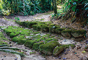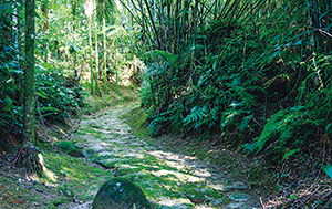 地元のガイドに付き添われて鬱蒼とした森に分け入ると、ところどころ苔に覆われた粗野な石畳が点在している。ぬかりやすい熱帯の海岸沿いの山脈を貫くため、かつてのラバと奴隷による物資の運搬には、石畳の敷設が不可欠だった。パラチーには8・7㎞に及ぶ石畳が残っており、黄金が搬送された18世紀の凹凸の激しい石畳に、コーヒーが運ばれた19世紀に補修された比較的平らな石畳が混在している。