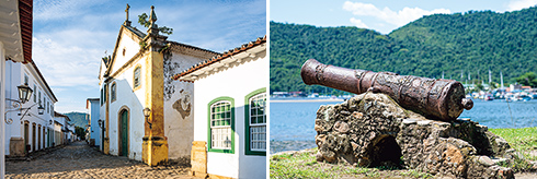 左から:パラチーの歴史地区の町並み。中央は1725年に建てられた黒人のための教会。/グランデ島を拠点としたフランスの私掠船などの対策に港に敷設された大砲。