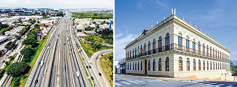 左から:開通70周年を迎えたドゥトラ街道。道中数々のパライーバ渓谷の街を通過する。サンパウロ国際空港のあるグアルーリョス市上空からの写真。©Comunicação da CCR NovaDutra/1864年に建設された、ピンダモニャンガバ市最大の農園を営んでいた”コーヒー男爵”の元邸宅。現在は歴史博物館として公開されている。