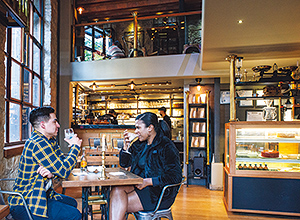 カフェのメニューも国際色豊かだ。国や地域の名前を冠したサンドイッチやパスタなどの軽食が並ぶ。アンデス原産のキヌアを多用するなど地域色を健康志向の客にアピールすることも忘れていない。コーヒーはエスプレッソをベースとした各種ラテが豊富だ。