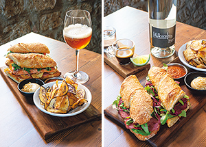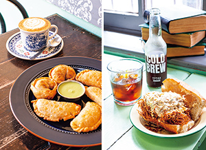 左から:エンパナーダの盛り合わせ(Bs31)とフラットホワイト(Bs18)。/3種のチーズとビーフジャーキーのサンドイッチ(Bs31)と自家製コールドブリュー(Bs22)。