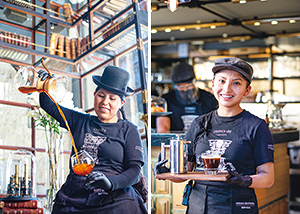 左から:伝統的なチョリータ衣装をまとうアマリアさんは、調理スタッフからバリスタに転身。当店独自の注ぎ方は、適温にするための工夫。/スタッフの制服はTシャツ、手袋、マスクなど黒一色で統一。Tシャツの絵柄はボリビアのティワナク遺跡をリスペクト。
