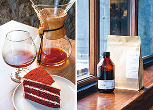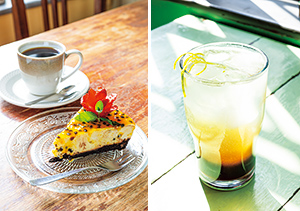 左から:チーズケーキ(Bs21)と自社焙煎ブランド「ラ・エンビディア」のペーパードリップ(Bs22)。/コーヒーの皮を煎じ、レモン、炭酸水を加えた「スルタナ・ソーダ」(Bs20)。