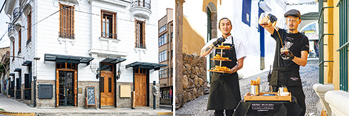 左から:建物の左側の一角でブロンセを営業。増設した建物の4階以上はガラス張りの造りとなっている。改装に10年を費やし、ホテルとして生まれ変わる。/コーヒードリンクとパティスリーとともに観光名所を巡る「コーヒー・エクスペリエンス」はアラルコンさんが企画したVIP待遇の市内ツアー。石畳の細道ハエン通りにて。