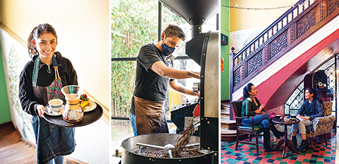 左から:接客も務めるバリスタのミシェル・ペニャランダ・エイサギーレさん。キッチンとホールを行ったり来たり。/焙煎を担当して2年目のクリスチャン・サンカリさんが豆の煎り具合に集中する。/1940年代に建てられた邸宅で営業するソポカチ店。この吹き抜けのホールを含む6つの喫茶スペースがある。他店舗もカジュアル&アンティークで統一。