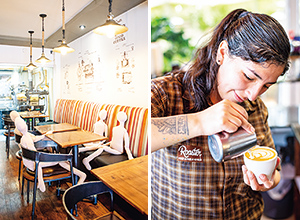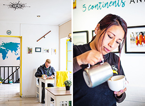 左から:スウェーデンカラーを配した店内。/次に紹介のロースターで自らバリスタ講座を受けたマネージャーのパウラ・モラレスさん。
