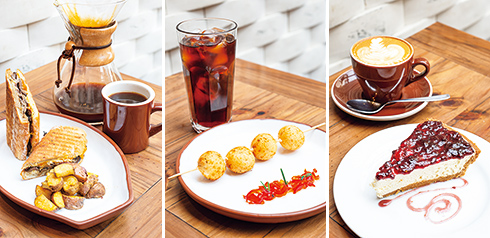 左から:牛肉のパニーニ(Bs45)と「マチャカ」ブランドのコーヒー(Bs19)。/ボリビア風ポン・デ・ケイジョ「クニャペ」(Bs14)とコールドブリュー(Bs20)。/チーズケーキ(Bs25)とカプチーノ(Bs16)。