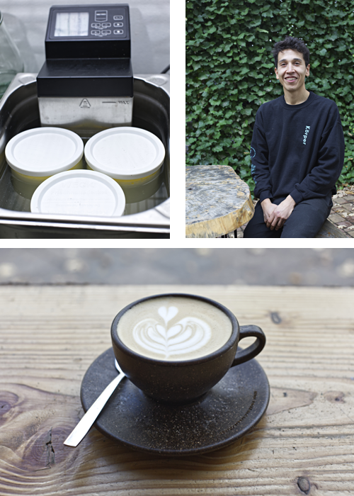 [上左]ミルクは、1日に8〜10リットル余剰が出る。これをヨーグルトなどに加工し、サイドメニューに使用。[上右]ピーターさん。「店内では、リラックスをしてくれることが第一なので、サーキュラーエコノミーをアピールはしていません。お客さんがコーヒーカップの素材やサイドメニューを見て、話が広がることも」[下]カプチーノ、3ユーロ。コーヒーメニューはコーヒーかすを使った「カフェフォーム」のカップで出している。(コーヒーかすのカップの記事)