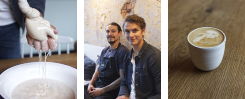 [左]「牛乳を絞ってるみたいだね!」とダヴィットさん。週に2〜3回オーナー自ら絞る。[中]オーナーのダヴィットさん(右)とミシュラン1つ星を持つベジレストランから引き抜かれたシェフのフランコ・ヤヒールさん。[右]ヘーゼルナッツミルクコーヒー 4,5ユーロ。決して安くはないが、デザート並みの満足度が。