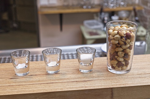 オーナー手ずから、毎週数回絞っているコーヒー用のミルク。素材は、ベルリン近郊でも豊富に取れるヘーゼルナッツだ。ナッツの香ばしい甘さとリッチな舌触りのミルクが、強い苦味を持つエスプレッソを引き立てる。