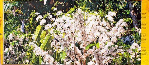 コーヒーの花は開花期間が2日ほどと短いので、開花したらすぐに知らせてもらえるように生産者にお願いし、電話を受けて、駆けつけて撮影しました。花の美しさを見てもらいたくて最終ページの見開きに掲載しました。