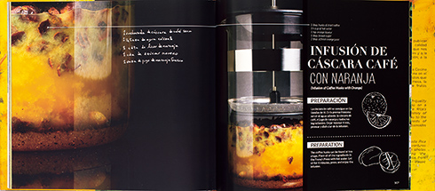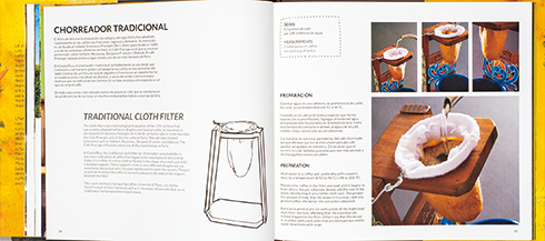 8種類のコーヒーの淹れ方をそれぞれ見開きで紹介。コスタリカで伝統的なチョレアドールからサイフォン、ケメックス、V60ドリッパーまで、コーヒー消費のグルメ化に合わせて、自ら淹れる楽しみを紹介した。