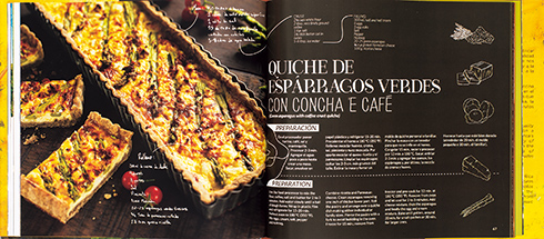 細かく挽いたコーヒー豆を生地に練り込んだグリーンアスパラガスのキッシュ。具材は、アスパラガスの他、卵、パルメザンチーズ、リコッタチーズなど。前菜の一品として紹介。