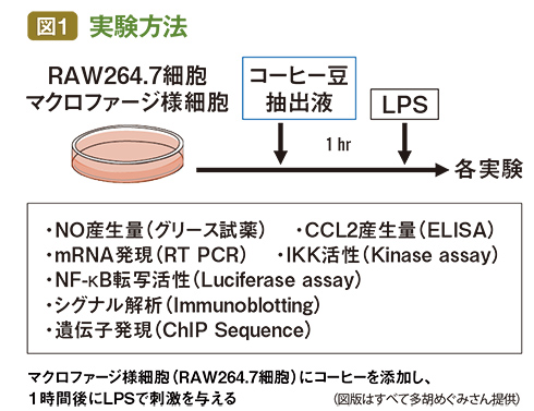実験方法は順を追って説明していくが、狙いは大きく2つある。①コーヒーが示す抗炎症作用をもたらすメカニズムの解明と、②抗炎症作用を示すコーヒーの含有成分を同定すること。まずは①から紹介しよう。