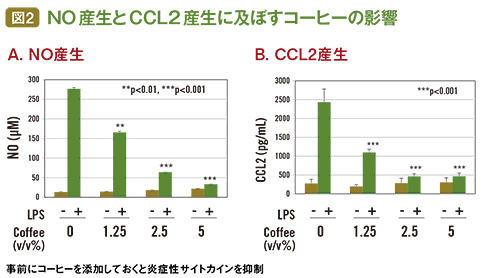 「濃度の薄いコーヒーでも、マクロファージに添加しておけば、炎症につながる一酸化窒素(NO)やサイトカインはほとんど出てこないのです」
