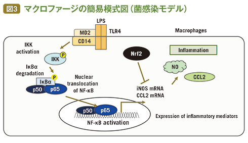 多胡さんが簡易的に作成したマクロファージの模式図を見てほしい(図3)。これは菌に感染したときのモデルだ。マクロファージが異物を認識した場合、NOやCCL2を産生して炎症に対抗しようとする。しかし、事前にコーヒーを添加しておくと、NOおよびNOを産生する遺伝子(iNOS mRNA)も、CCL2およびCCL2遺伝子(CCL2 mRNA)も抑制する結果となった。