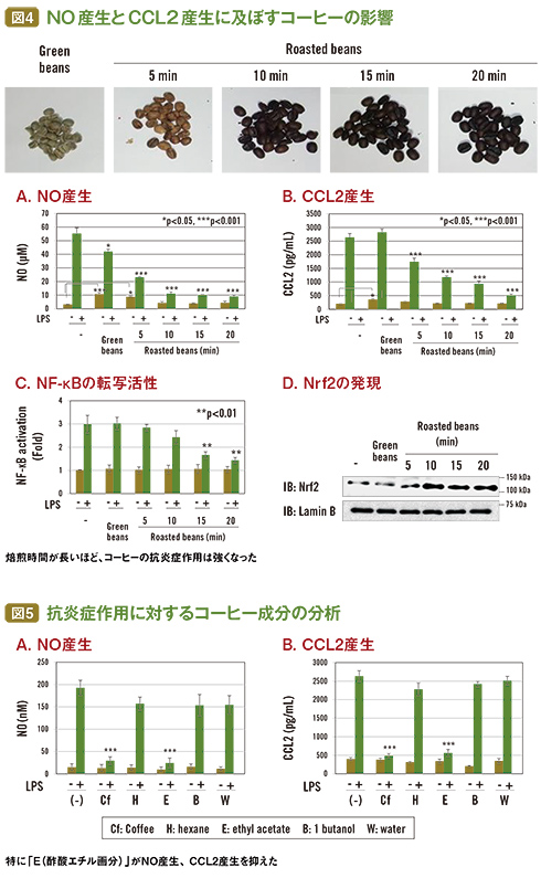 NO産生、CCL2産生、NF-KB、Nrf2を調べたが、いずれも「焙煎時間」が長ければ長いほどコーヒーがもたらす抗炎症作用は強くなることが明らかになった(図4)。