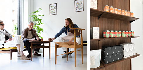 [左]デンマークの建築家、フィン・ユールの家具が置かれた店内。カールソンさんは月曜と火曜は焙煎所でローストを行い、水曜日から土曜日まではショップでバリスタとして働く。 [右]コーヒー豆からオリジナルのドリップ器具までがずらりと並ぶ。リサイクル素材を使ったパッケージは、ベルリン在住のデザイナーによるデザイン。