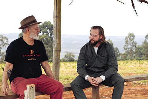 ブラジルの生産者と話す、「エイプリル」オーナーのカールソンさん(右)。新型 コロナウイルスで今は難しいが、現地に赴き、豆の種類や味、価格について対話することを重視している。二人の会話の様子は、YouTubeやエイプリルのウエブサイトでも見られる。そういう透明性も大切だという。