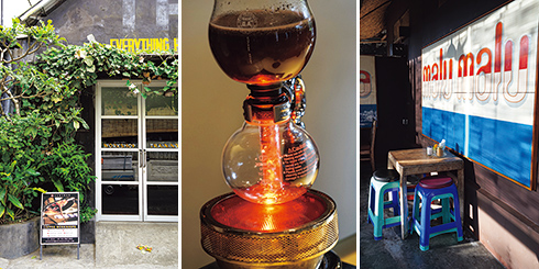 左から:カフェの向かいにあるロースタリー。煎りたてが店に。またここがワークショップの会場でもある。/古式ゆかしいサイフォンがリバイバル。/通りに面したテラス席。店は2階部分がメインフロアになっている。