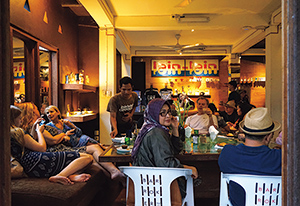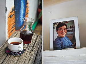 左から:西ジャワから取り寄せた豆でコーヒーを淹れるスタッフ。淹れ方はハンドドリップと水出しのみ。/狭く雑然としたスペースは友人の部屋に招かれたよう。/ほぼ毎日通ってくるという常連客のディッキーさん。